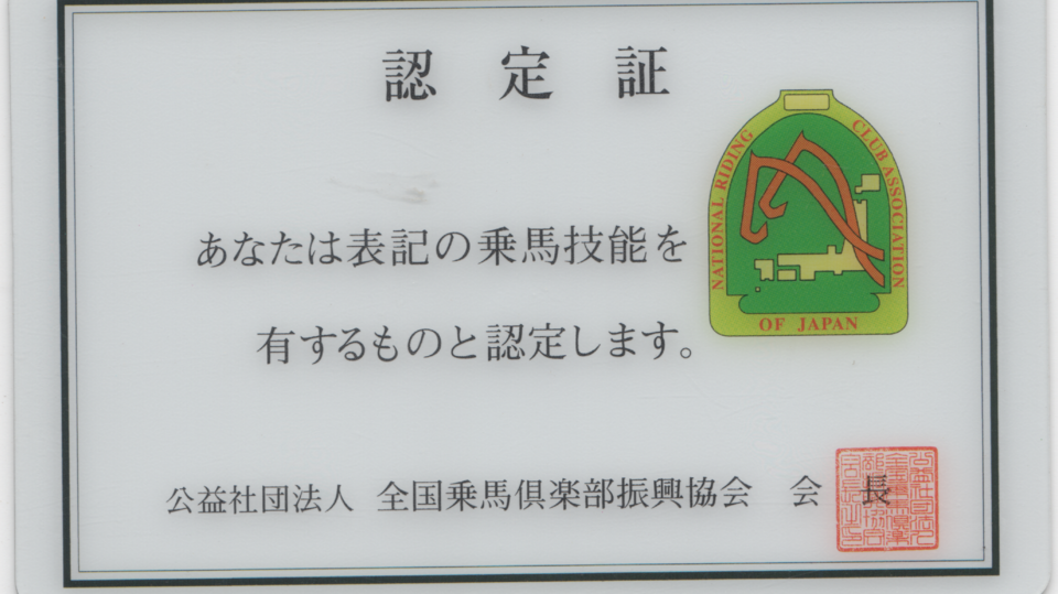 こちらは社)全国乗馬倶楽部振興協会が認定している乗馬の技術を証明する資格です。